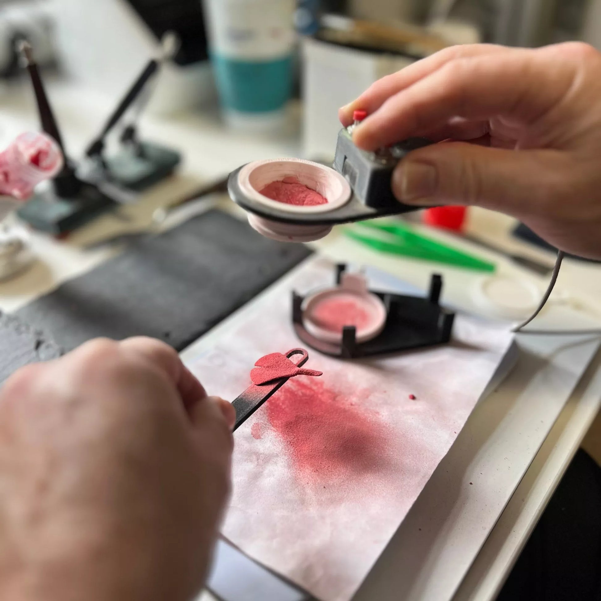 Jedes Schmuckstück wird in unserem Atelier gefertigt und weist einzigartige Nuancen auf, die durch die Arbeit mit Emaille und den Brennprozess entstehen.